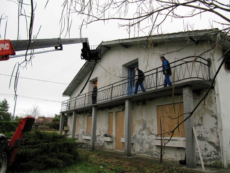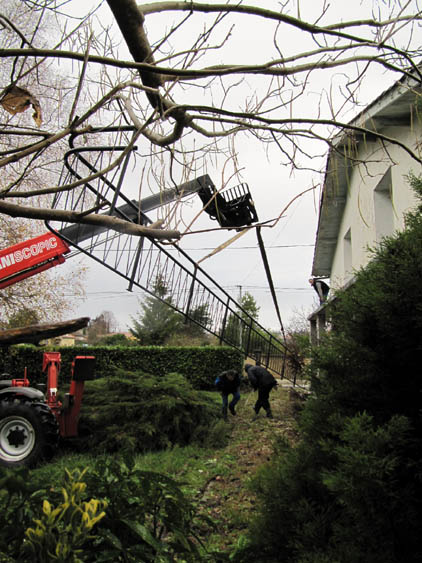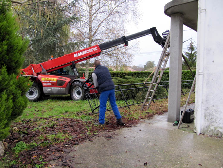 Heute morgen um viertel vor neun war es dann soweit: Herr Laurent und ein Mitarbeiter rückten an, um das Balkongeländer wieder anzubringen. Sie brachten ein Arbeitsgerät namens Manitu mit. Das Teil wurde knapp vorbei an unserem neu angelegten Gemüsegarten vor die Balkonfront gefahren – ohne den Wasserhahn umzufahren, der mitten im Garten steht.