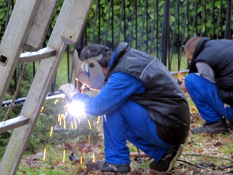 Dann haben die beiden an dem hängenden Geländer Befestigungsplatten angeschweißt, die hinterher am Balkon angeschraubt werden.