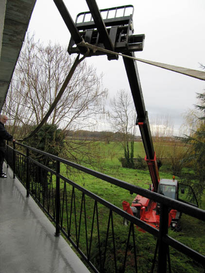 Vorne dran hat der Manitu eine Art Gabel, die wurde ein Stück ausgefahren, und an ihr wurde mit einem dicken Seil das Geländer befestigt und ein Stück hochgezogen.