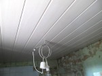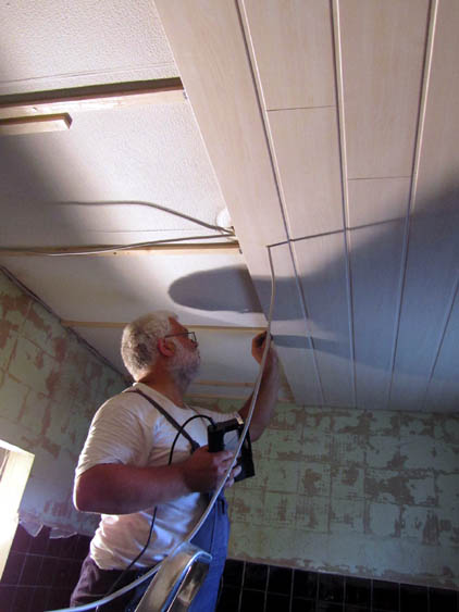 Hier ist die Decke fertig. Die letzten Paneelen mussten wir längs zurechtschneiden, um sie der Form der Badezimmerdecke anzupassen.