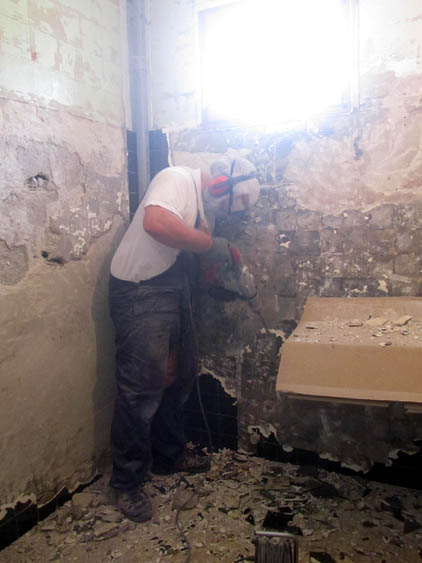 Dann hat Leo angefangen, mit dem Bohrhammer die Fliesen zu entfernen. Wenn es hier etwas neblig auf dem Foto aussieht, so ist der Grund dafür nicht falsche Belichtung durch Gegenlicht, sondern Staub. Es ist wirklich unglaublich, wieviel Dreck das macht, und dieser Staub kriecht überall hin – selbst wenn die Türen geschlossen sind, kriecht der Staub drunter durch. Hier ist im Erdgeschoss nur noch Staub, Staub und überall Staub. Wenn wir irgendwas anfassen, sind die Finger gleich staubig.