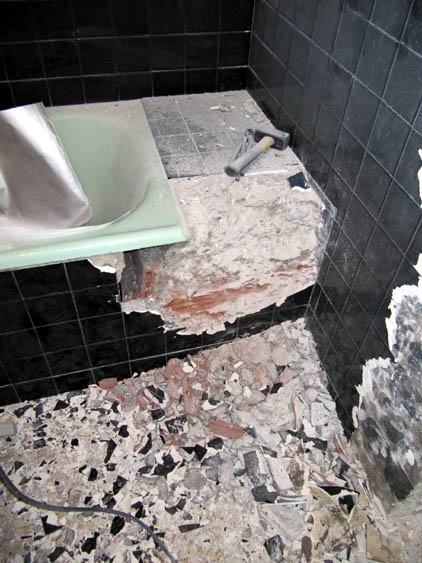 Ob wir die Badewanne aber wirklich schon morgen rausschaffen können, steht noch nicht fest, denn bei den Abbrucharbeiten hat Leo heute festgestellt, dass der Teil zwischen Badewanne und Wand aus einem massiven Betonklotz besteht, und der lässt sich kaum mit dem Bohrhammer entfernen, ohne dass dieser heiß wird.