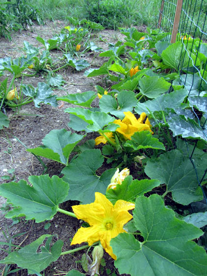 Noch zwei Gartenfotos zur Beruhigung (wobei das ja auch nicht so richtig beruhigend ist, denn der Garten quillt über vor Unkraut, das wir mangels Zeit nicht beseitigen können): Die Zucchini veranstalten ein wahres Blütenmeer, und nächste Woche werden wir die ersten ernten und essen können.