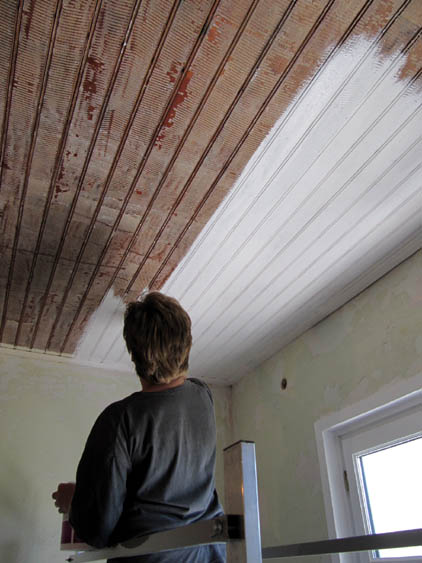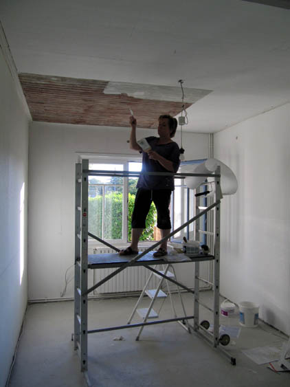 Eine weitere gute Idee hatte sie noch, nämlich die Decke ihres Wohnzimmers nicht auch erst mit Styropor und Rauhfaser zu bekleben, sondern sie einfach zu streichen. Die Decke ist ja aus Holz, und wir hatten irgendwann schon mal überlegt, sie zu streichen, das dann aber verworfen, da der ganze alte Kleber von der früheren Tapezierung noch dranhängt und sich auch nicht ablösen lässt. Nachdem meine Schwiegermutter nun heute das Streichen vorgeschlagen hatte, habe ich es mit Vorstreichfarbe mal ausprobiert, und es sieht gar nicht mal schlecht aus. Natürlich ist es nicht völlig gleichmäßig, aber es ist weniger schlimm, als wir dachten. Mal sehen, wie es nach dem zweiten Lackieren aussieht.