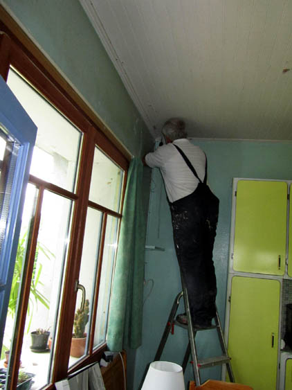 Da wir nicht wussten, wann er genau kommen würde, überlegten wir hin und her, ob es sich noch lohnt, mit dem Anstreichen des Schlafzimmers anzufangen. Um in dieser Zeit des Überlegens nicht sinnlos herumzusitzen, haben wir das Netzwerkkabel, das den Laptop in der Küche (der sich, wie berichtet, weigert, drahtlos ins Internet zu gehen) bislang über die Treppe von oben nach unten quer über den Flur quer durch die Küche mit unserem Router verbindet, mit viel Gefummele durch ein Loch in der Decke der Küche gezogen. Leo hatte kürzlich ausfindig gemacht, dass da irgendein ungenutztes Kabel durch ein Loch im Fußboden unseres zukünftigen Schlafzimmers in die Küche führt. An dieses Kabel haben wir das Netzwerkkabel geklebt, und dann mit dem alten Kabel und viel Rumgedrehe das Netzkabel durch die Decke gezogen. Jetzt verfügen wir über den Luxus eines Netzwerkkabels, das aus der Küchendecke baumelt, und wir müssen nicht mehr ständig über das Kabel auf der Erde stolpern.