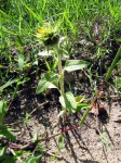 Zwischen all den Sonnenblumen neben unserem Gemüseacker, die ca. zwei Meter hoch sind, ist eine einzige Sonnenblume, die 10 Zentimeter hoch ist. Hier links habe ich sie markiert, rechts ist sie in Großansicht zu sehen. Sofern man überhaupt von «Groß»ansicht sprechen kann. Wir vermuten, dass sich ein Samenkorn der Sorte «Matzerath» dort eingeschlichen hat und nennen sie nun liebevoll Oskar