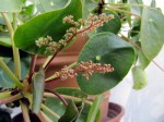 Und noch etwas Grünzeug: Diese Pflanze, deren Namen ich bis zum April nicht kannte und die ich dann als «Pilea Peperomioides» identifizieren konnte, blüht! Ich weiß nicht, seit wieviel Jahren oder Jahrzehnten ich sie bzw. Ableger davon habe, aber eine Blüte habe ich noch nie daran gesehen. Da zeigt sich mal wieder: hier ist vieles anders als früher.
