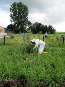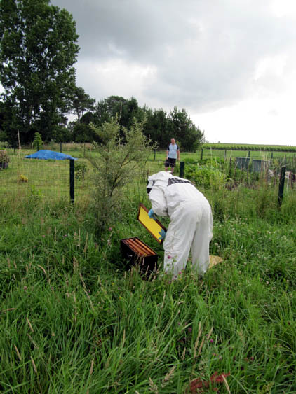 Während er mit uns sprach, krabbelten diverse Bienen aus seinem Anzug heraus. Es hätte mich nicht gewundert, wenn ihm auch aus Nase und Ohren ein paar Bienen gekrochen wären. Nach kurzer Zeit hatte er den Schwarm eingesackt bzw. eingekastet. Er sagte, es sei ein recht kleiner Schwarm, und er würde ihn mit einem anderen «verheiraten». Na dann.