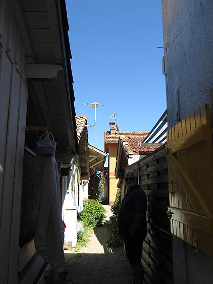 Auf dem Rückweg haben wir in Le Canon gehalten, dort gibt es einen Aussichtspunkt auf das Bassin d’Arcachon. Von dem aus sind Leo und ich eine steile Treppe hinuntergestiegen zu einer Ferienhaussiedlung, in der die Häuser total eng zusammenstehen. Zwischen den Häusern führen schmale sandige Fußwege zum Strand …