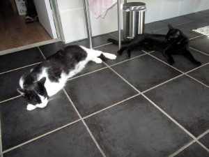 Die Kater sind froh, wenn sie auf kühlen Fliesen herumliegen können, sie sind momentan nicht sehr aktiv.