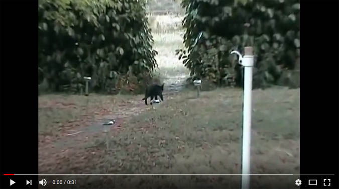 Vor unserem Hauseingang ist eine größere Rasenfläche, auf der einige Bäume stehen, und die mit einer Hecke umrandet ist. Dort kann man sehr schön wind- und sonnengeschützt herumsitzen oder -liegen. In dieser Hecke ist ein Durchgang, durch den man in den Gemüsegarten und auf den Rest des Grundstücks gelangt. Und in der Hecke links und rechts von diesem Durchgang scheinen offenbar katzenfressende Monster zu leben – oder wir vermuten zumindest, dass Jacques das glaubt, denn er geht NIE normal hier hindurch, sondern nur so (ein Klick auf das Foto leitet in einem neuen Tab zu YouTube, dort wird der Film dann abgespielt) :