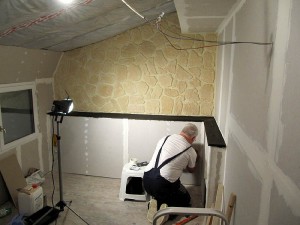 Als wir früher mal solche Naturstein-Imitate für Wände in Baumärkten gesehen haben, fanden wir die ja eher albern. Aber nachdem wir uns das dann genauer angesehen hatten, haben wir uns entschlossen, die Wand über dem Podest hinter dem Bett auch mit solchen Naturstein-Imitaten zu verkleiden. Also im Klartext: Wir haben die Natursteinwand mit Gipskartonplatten verkleidet und auf die Gipskartonplatten Natursteinimitate geklebt :m-lol:. Aber die Natursteinwand an sich hätten wir nur erhalten können, indem wir die Außenwand gedämmt hätten – und den Aufwand wollten wir uns nicht antun. Und so, wie es jetzt ist, sieht es sehr schön aus.