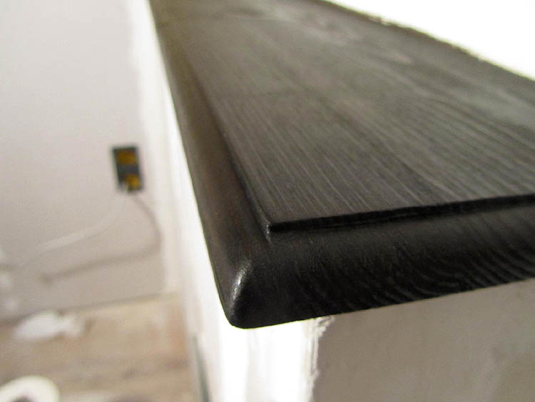 Unter der Pseudo-Natursteinwand ist ein Podest, hinter dem die Heizungsrohre verlaufen. Leo hat zwei Kiefern- bzw. Tannenholzplatten mit der Oberfräse so bearbeitet, dass sie oben einen kleinen Absatz haben und nach unten hin abgerundet sind, und ich habe sie dann abgeschleift und mit dunklem Wachs bearbeitet, so dass sie jetzt aussehen wie ganz alte Holzbretter. Sieht extrem gut aus.