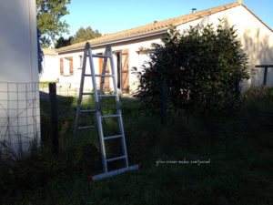 Ab April hatten wir schon einen Schlüssel für das Haus. Die Ex-Nachbarn waren bereits ausgezogen, und meine Schwester hat mitsamt tatkräftigen Helfern während der Osterferien renoviert, die Wände gestrichen etc. Um nicht immer über die Straße um das andere Nachbarhaus herumgehen zu müssen, diente diese Leiter bis vor kurzem als „kleiner Dienstweg“.