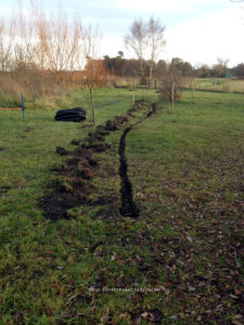 Wenn es heftig regnet, steht hier gerne mal die Wiese unter Wasser. Damit die Hühner dann nicht in der Matsche herumstapfen müssen, wurde dieser Graben ausgehoben, in den der schwarze dicke Schlauch gelegt wird, den man auf dem Foto sieht. Das ist ein ganz fein perforiertes Drainagerohr, durch das das Wasser dann in den kleinen Graben, der quer über das Grundstück läuft, abfließen kann.