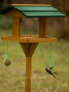 Und noch was anderes tierisches: Bislang hatten wir hier im Winter kein Vogelhäuschen, da es eigentlich selten so richtig kalt wird und die Erde gefriert. Aber in diesem Jahr kam ständig eine Amsel (vielleicht auch mehrere, die kann man ja so schlecht auseinanderhalten …) auf die Fensterbank der Küche geflogen und hat sich dort an dem Katzen-Trockenfutter bedient, das da immer steht. Da dachten wir, die armen Piepmätze, wenn die so einen Hunger haben, holen wir mal ein Vogelhaus. Gedacht, getan, zusammengebaut, aufgestellt. Und nachdem Leo das ganze dann unten mit ein paar Sonnenschirmständern beschwert hat, fällt es auch nicht mehr ständig um. Meisen, wie hier zu sehen, hängen ständig an den Knödeln und gehen eher selten ins Haus. (Auch die Hunde mögen die Knödel offensichtlich sehr gerne und müssen ständig davon weggescheucht werden.)