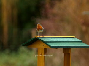 Rotkehlchen und ab und zu mal Spatzen sitzen nicht nur auf, sondern manchmal auch in dem Haus und essen was. Aber die Amseln? Die bedienen sich nach wie vor am Katzenfutter auf der Fensterbank