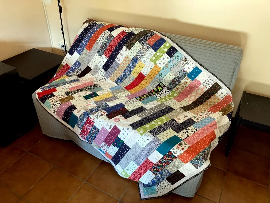 Den Rest des Nachmittags habe ich damit verbracht, Stoffreste zurechtzuschneiden, denn Leo will jetzt auch so einen Quilt haben wie diesen hier, der vorgestern nach gerade mal zwei Wochen Näharbeiten fertig geworden ist: