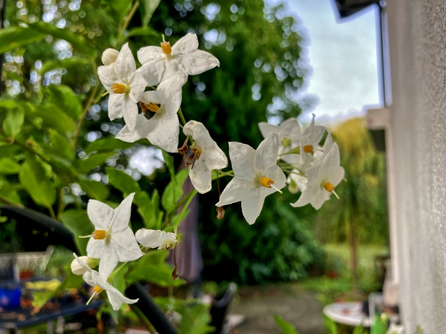 Auf dem ersten Foto oben ist der Sternjasmin neben der Haustür zu sehen, der dieses Jahr leider nicht allzu üppig blüht.