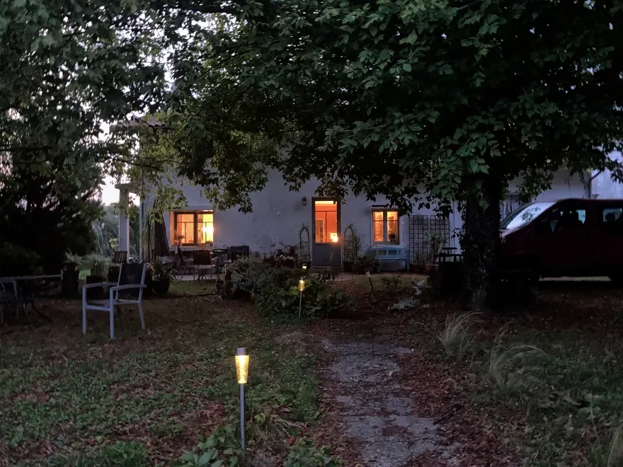 Abendstimmung vor dem Haus, viel Laub liegt da herum: