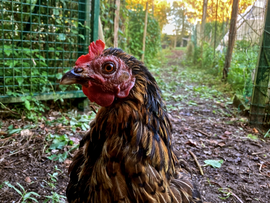 Foto 1 oben: Huhn kurz nach dem Aufstehen.