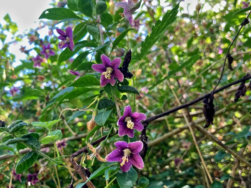Am Rand unseres Gemüsegartens steht ein Goji-Busch, der momentan sehr viele Blüten hat: