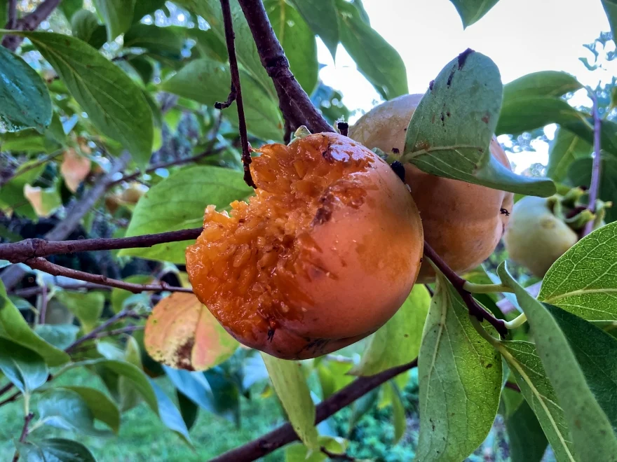 Wenn sie dann zu Beeren werden, werden sie wahrscheinlich wieder schneller als man hinschauen kann von Vögeln weggefressen. Und nicht nur die Goji-Beeren. Vor drei Wochen hatte ich hier ja ein Foto von den unreifen Kakis am Baum gezeigt. Nun ist eine ziemlich reif, und wir waren wieder zu langsam mit dem Ernten: