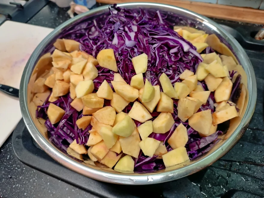Leo hat gestern einen großen Kopf Rotkohl gekauft und ihn nun mit Äpfeln, Wein und diversen Gewürzen eingelegt:
