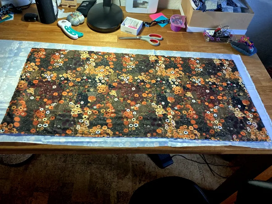 Heute nachmittag hatte ich endlich mal wieder Zeit, ein wenig zu nähen, und habe eine kleine Decke angefangen für ein Schränkchen in unserem Schlafzimmer, das oben verkratzt ist und nicht mehr sehr schön aussieht. Eigentlich dachte ich, ich werde heute damit fertig, aber das wird wohl erst morgen was: