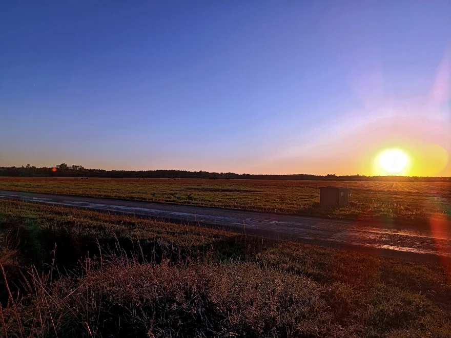 Leo hat von seinem Hundespaziergang heute Abend ein Foto vom Sonnenuntergang über abgeerntetem Maisfeld mitgebracht: