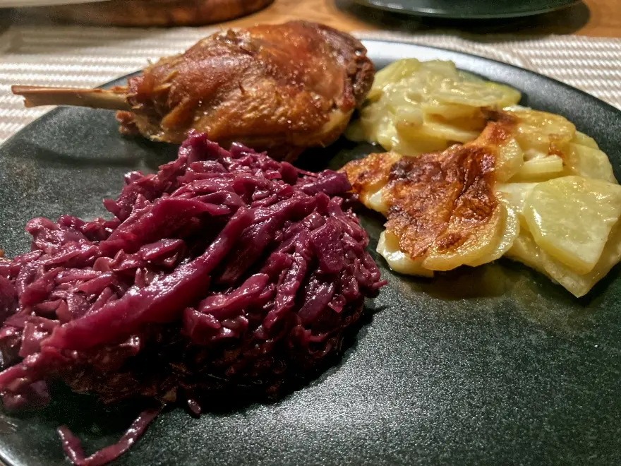 Später gab es dann den inzwischen gekochten Rotkohl, mit Kartoffelgratin und Confit de canard: