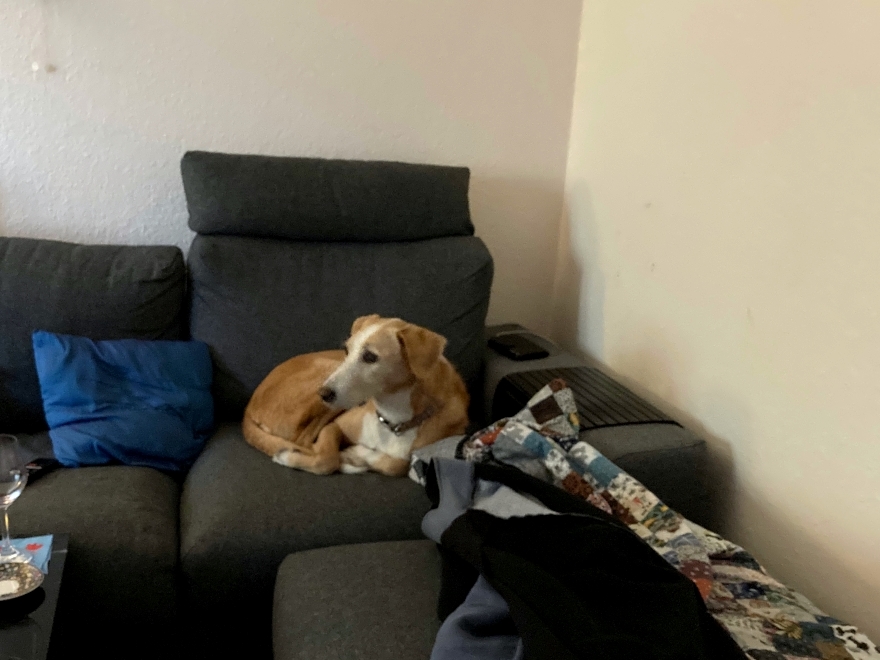 In der Nacht war es sehr stürmisch draußen, das war wohl Ellys Entschuldigung dafür, dass ich sie heute früh auf dem Sofa vorfand – eigentlich gehören die Hunde bei uns seit einigen Jahren nicht mehr aufs Sofa. Naja. Wenn’s ihr geholfen hat … Das Foto ist recht unscharf, da es noch nicht richtig hell war.