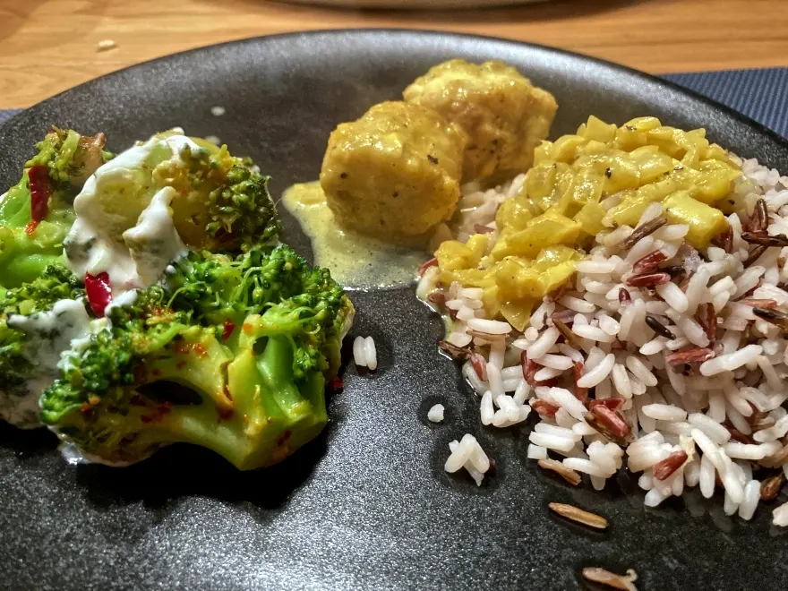 Zum Essen gab es abends Seeteufel in Safransoße mit Broccoli in Sardellenjoghurt – mit der Soßenzubereitung hatte Leo schon vormittags angefangen und einen Fischfond gekocht.