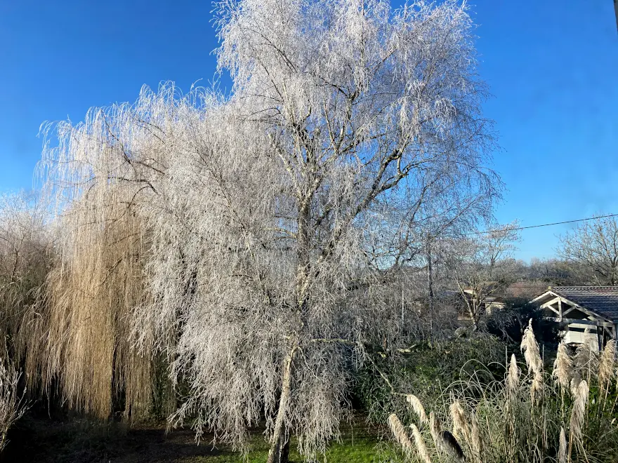 Die Birke im Garten sah wunderschön aus mit den dünnen, filigranen Ästen, die vom Raureif überzogen waren: