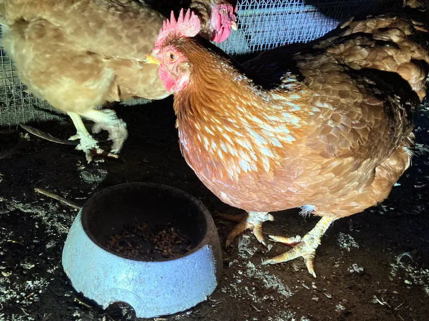 Als ich kurz vor 18 Uhr, als es schon fast dunkel war, die Hühner einschließen wollte, kamen mir zwei von ihnen freudig entgegengelaufen. Normalerweise sind sie um die Zeit und vor allem bei Fast-Dunkelheit schon im Stall. Mit ein paar Körnern ließen sie sich aber hineinlocken: