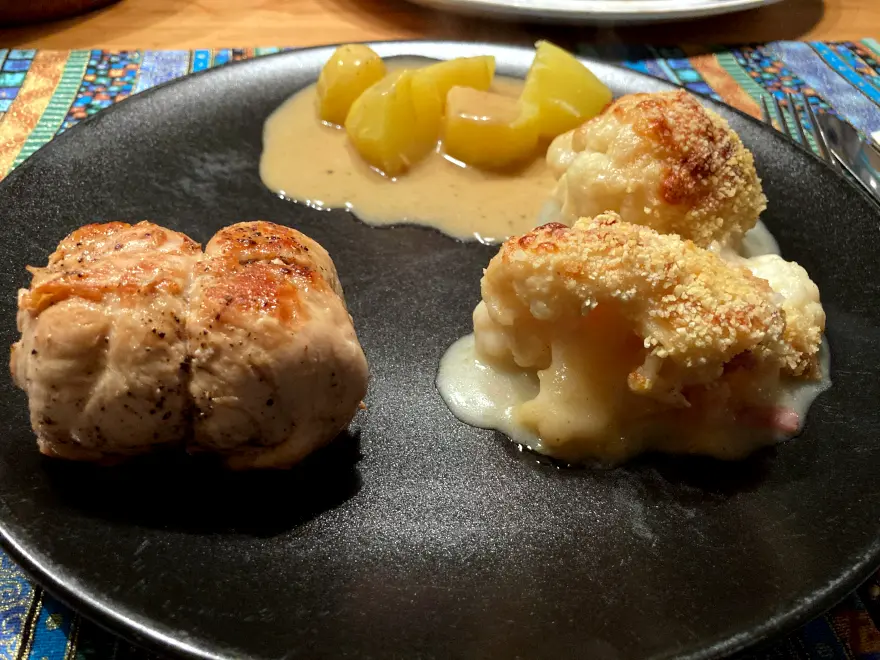 Zum Abendessen hat Leo uns paupiettes aus Putenfleisch gemacht, das sind kleine gefüllte Rouladen, mit überbackenem Blumenkohl und Kartoffeln: