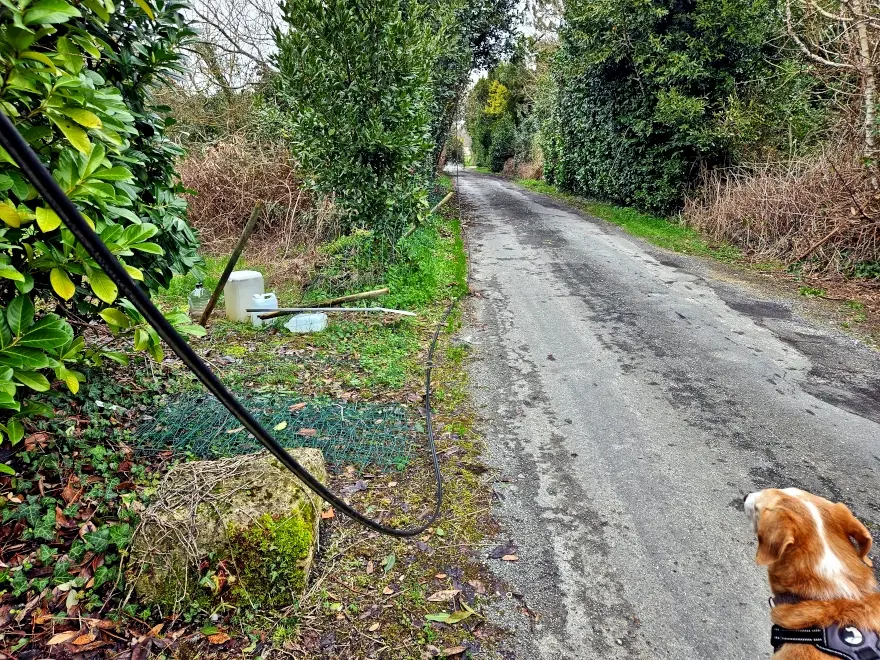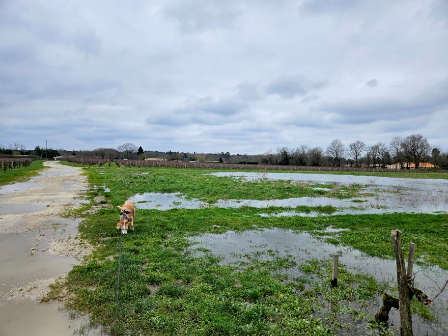 Regen, Regen, Regen. Wiesen und Weinfelder stehen voll Wasser, Straßen sind zum Teil überschwemmt. Entlang der Straßen liegen immer noch jede Menge Bäume, die vom Sturm umgerissen wurden, von den Strom- und Telefonmasten sind Kabel abgerissen und liegen an manchen Stellen noch auf der Erde – hier z.B., als wir gerade eine trockene Phase zum Spaziergang genutzt haben: