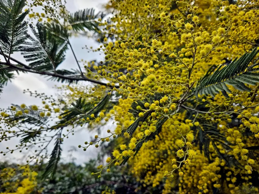 Die Mimosen fangen an, zu blühen. Ein kleiner Farbtupfer in all dem Grau: